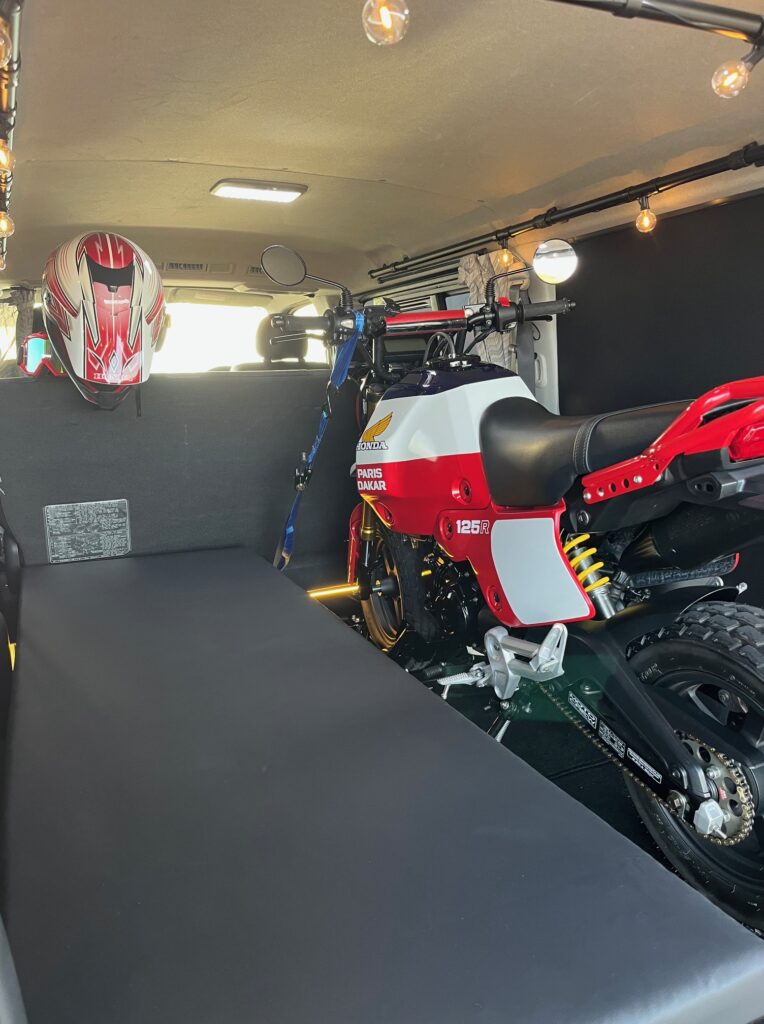 このグロムは、単なる移動手段ではありません。クアトロライダーさんのライフスタイルである**「トランポ車中泊」**に欠かせない、最高の遊び道具なのです。