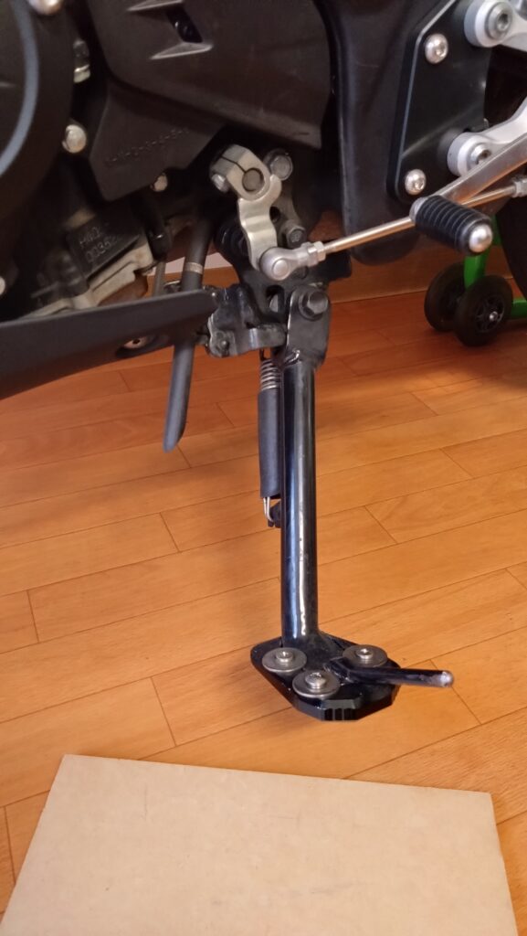 これまでも多くのサイドスタンドプレートが発売されてきましたが、そのほとんどが接地面を広げるための薄いもので、傾きを根本的に是正してくれるものは少なく、私も半ば諦めていました。