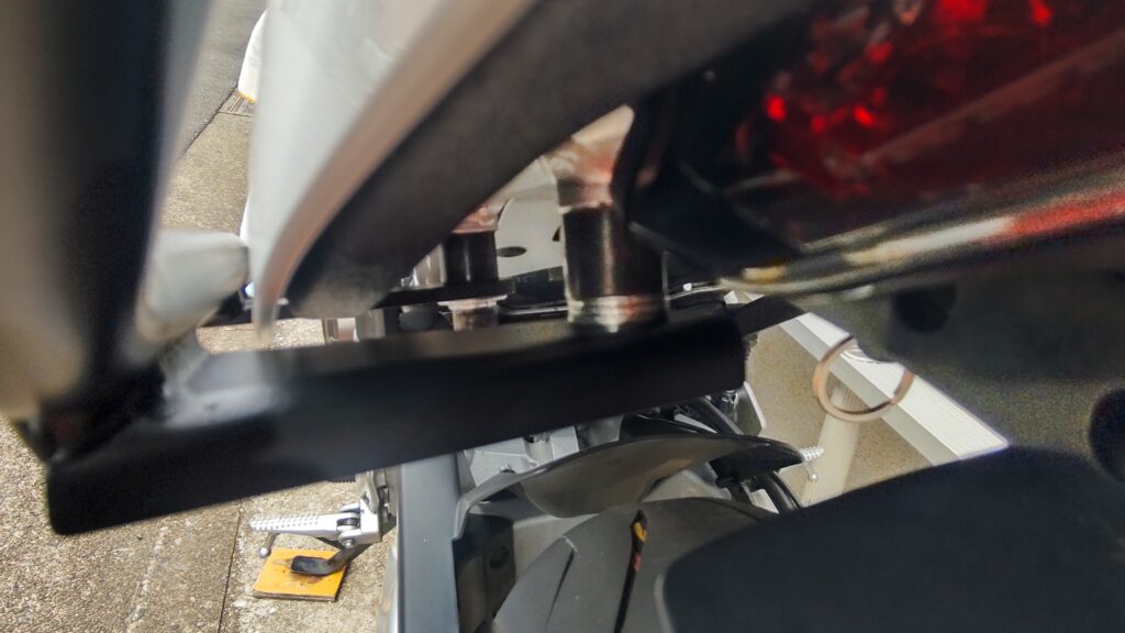- スペーサーとボルトの延長が必要! 付属のネジとカラーだけでは、シングルシートカウルとキャリアが干渉してしまいます。僕の感覚では、カラーにM10のナットを追加するくらいのスペーサーと、それに合わせて延長分のM8ボルトを用意する必要があります。