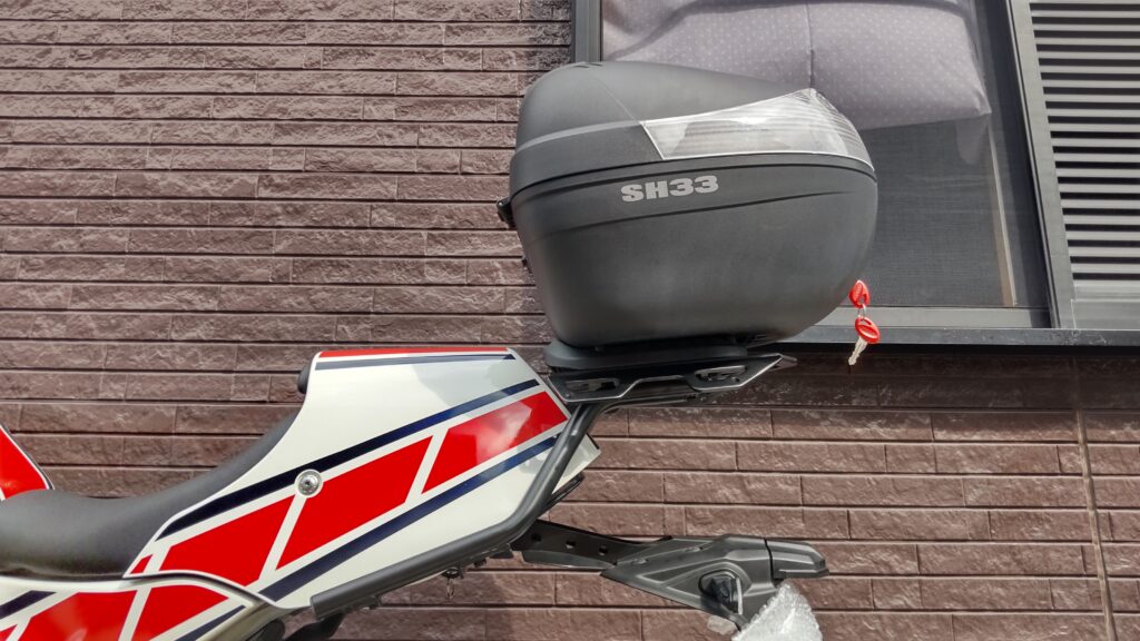 このDAYTONAのマルチウイングキャリアは、SHADのSH33トップケースのベースプレートもしっかりと固定でき、積載性は格段に向上!既存のボルトでは長さが不安だったので、ベースプレート固定用に長いボルトに変更しました。